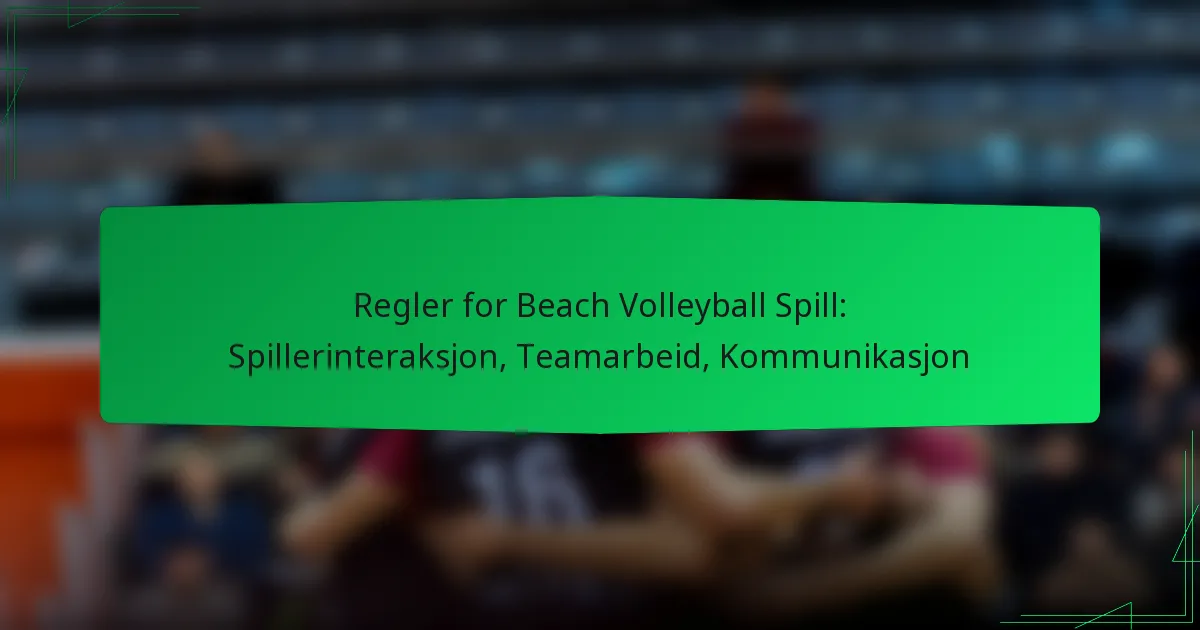 Strandvolleyballspill reguleres av de offisielle reglene satt av Fédération Internationale de Volleyball (FIVB), som understreker viktigheten av spillerinteraksjoner, lagarbeid og kommunikasjon. Disse elementene er essensielle for å forbedre ytelsen og skape en positiv atmosfære, enten i konkurransesammenheng eller i rekreasjonelle settinger. Ved å fremme effektiv kommunikasjon og samarbeid kan lagene betydelig forbedre sitt spill og tilpasningsevne under kampene.